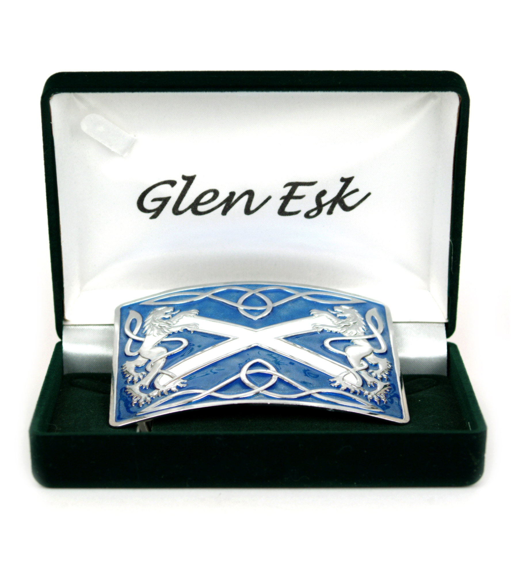 “Glen Esk” Blue Saltire Buckle. Gift boxed. Ideal gift. Approx size 3.5″ x 3″ Available in Chrome or Antique finish