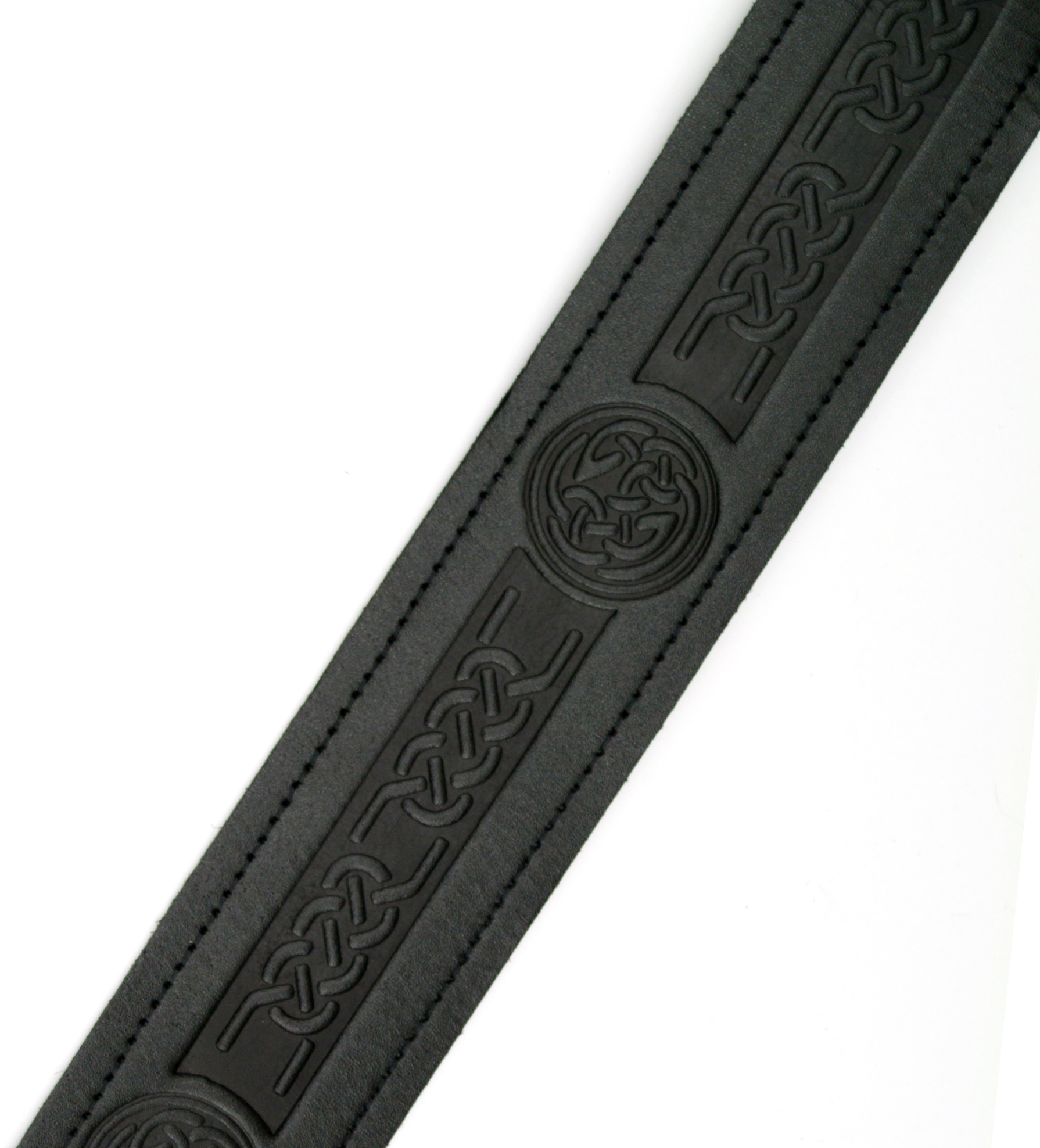 Celtic / Thistle Embossed Black Leather Kilt Belt. Available in a choice of sizes from 26″ – 56″. Fully adjustable velcro backing.