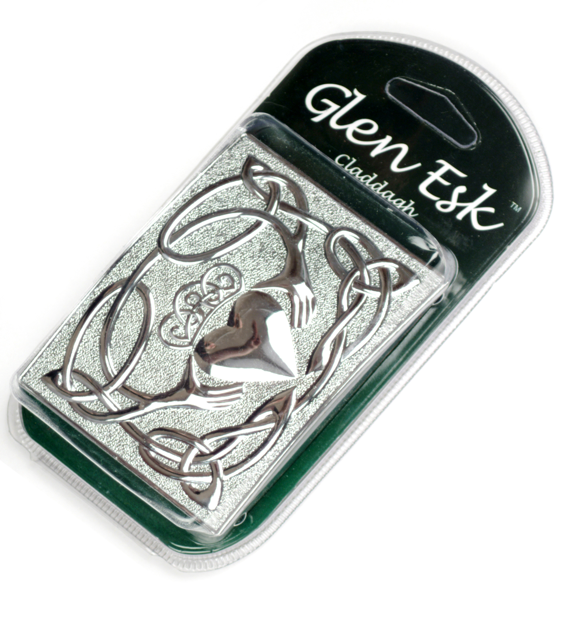 “Glen Esk” Claddagh Buckle in chrome effect finish. Comes blister packed. Approx size 3.5″ x 3″